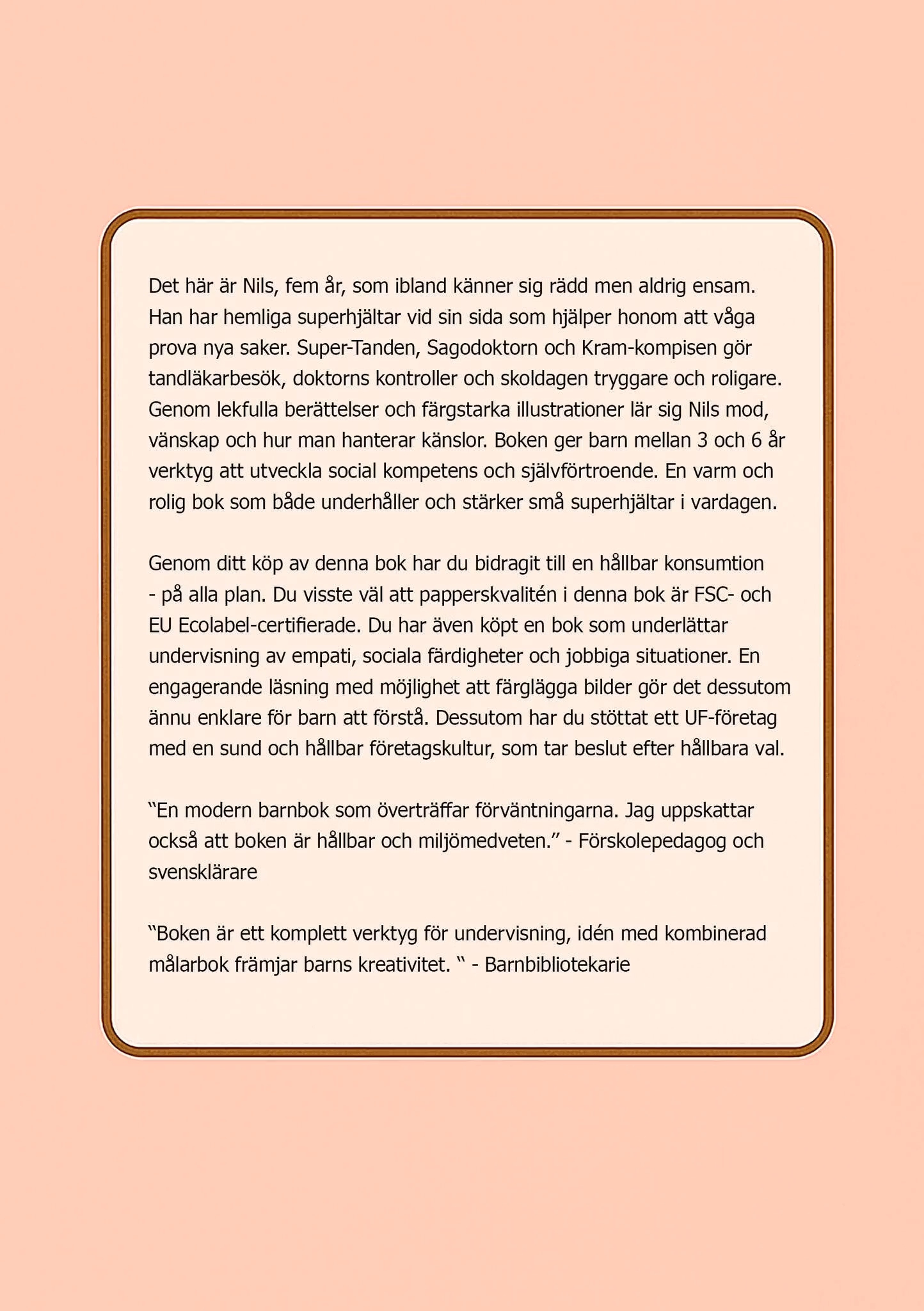 Nils hemliga superhjältar är framtagen i samarbete med erfarna rådgivare och passar för användning i förskolor, skolor, bibliotek och hem. Genom sitt unika innehåll och sin hållbara produktion erbjuder boken ett modernt verktyg för att stärka barns empati, samarbetsförmåga och sociala medvetenhet.